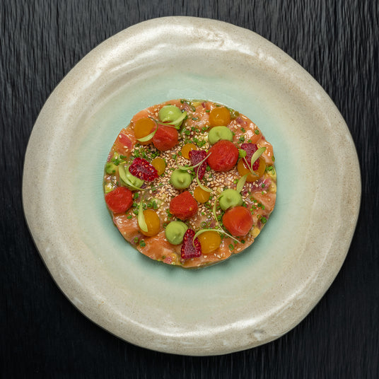 aguacate, cebolla roja encurtida, salsa miso-yuzu y kimchee, tomates cherry encurtidos y crujientes de yuca y chili