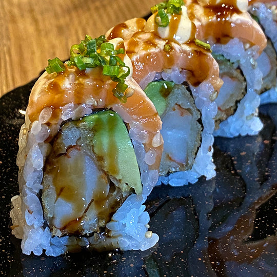 langostino en tempura, aguacate, salmón, emulsión de kimchee y salsa anguila