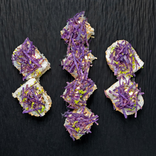 Roll de pez limón marinado y en tempura, aguacate, mayo de lima y chips de patata